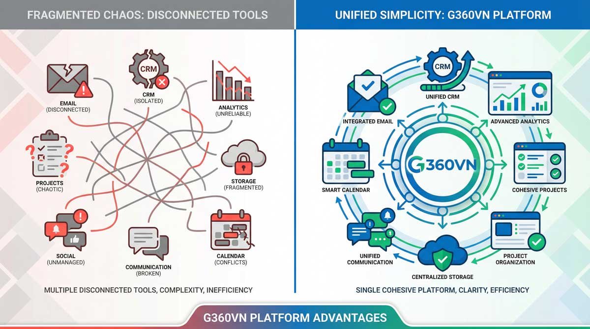 Enter G360VN—a platform that challenges the “best-of-breed” philosophy entirely. Instead of forcing you to stitch together dozens of tools, G360VN brings everything under one roof: marketing automation, analytics, CRM, e-commerce management, content creation, team collaboration, and security—all in a single, intuitive dashboard.